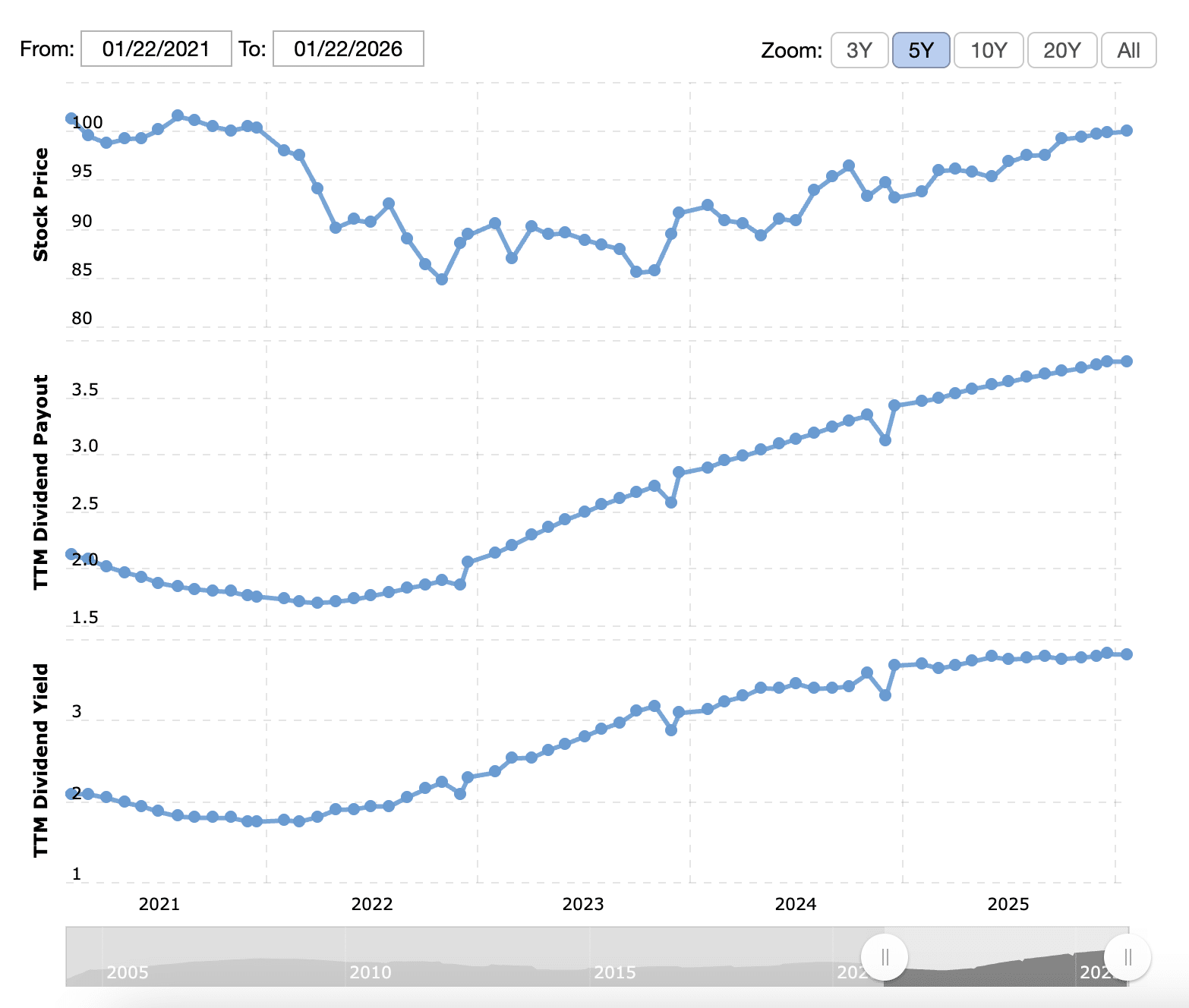 The 5-year bond purchased in late 2021, for example, has provided a 1%-per-year income stream in 2022, 2023, 2024, and 2025. Then one more 1% here in 2026.